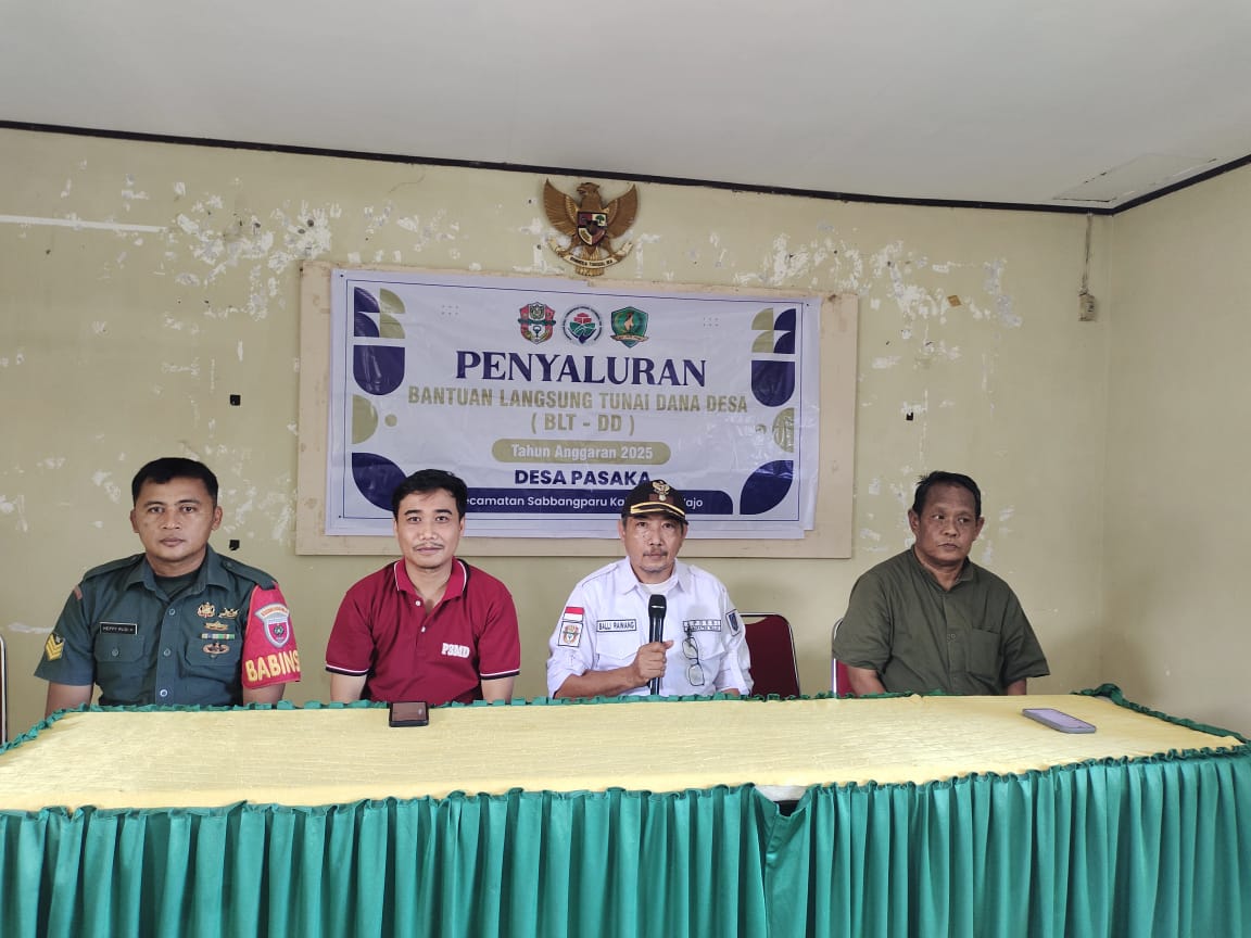 Pasaka, 17 September 2025 – Pemerintah Desa Pasaka, Kecamatan Sabbangparu, Kabupaten Wajo menyalurkan Bantuan Langsung Tunai Dana Desa (BLT-DD) untuk triwulan III tahun 2025. Kegiatan tersebut berlangsung di Aula Kantor Desa Pasaka dan dibuka langsung oleh Kepala Desa Pasaka, Balli Rawang.